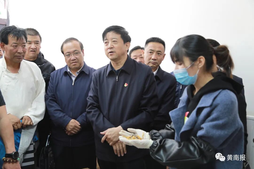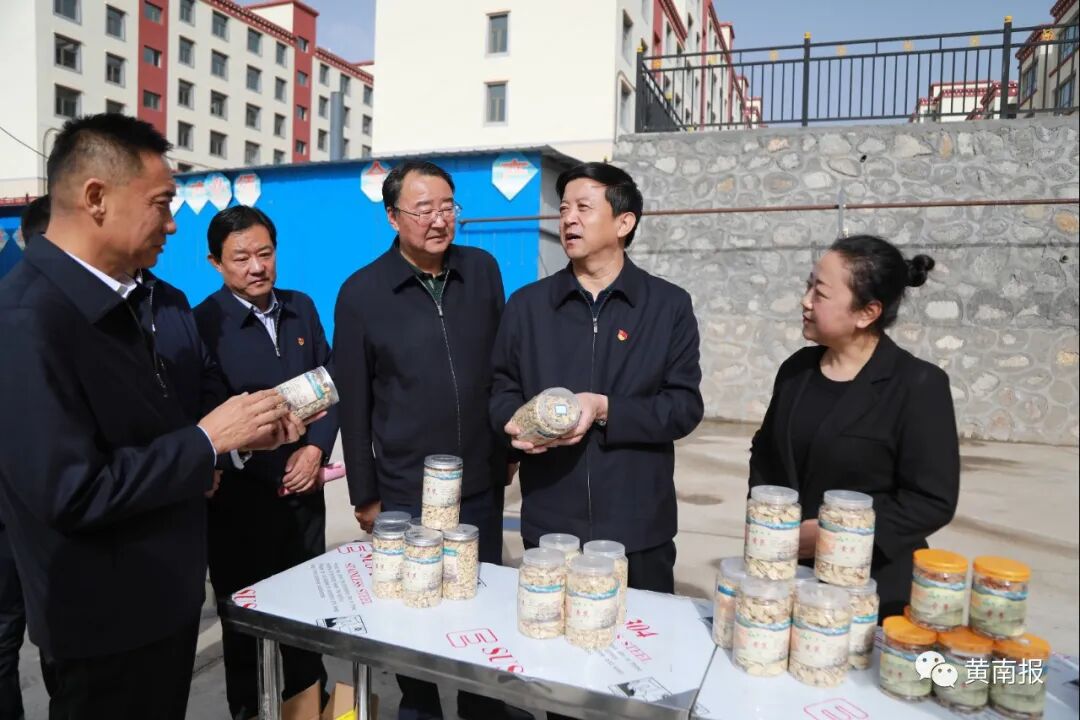 雨后的隆务地区,碧空如洗,空气清新。王振昌首先来到同仁县扶贫产业园区,听取全县中藏药材产业发展规划、相关政策措施及中藏药材生产流通情况,并实地查看了格拉拉商贸有限公司中藏药材加工车间,详细了解当归、黄芪等药材种植加工、饮品加工生产、产品销售收入等情况。王振昌指出,2019年以来,同仁县认真落实州委、州政府打造中藏药“药王谷”的总体安排,按照“生产基地+合作社+农牧民+企业”的运行模式,在加吾、黄乃亥、牙浪、曲库乎乡等浅脑山地区种植黄芪、当归、党参等中药材,种植规模目前已达1万亩,带动1000余名群众增收致富,发展思路符合同仁实际,在种植业结构调整和推动产业多元发展方面走出了一条新路。他指出,2016年脱贫攻坚工作开展以来,州委州政府高度重视,先后投入近5亿元资金推进到户产业扶贫工作和村集体经济发展,产业扶贫有起色、有突破、有成效,但也存在组织化程度低、资产入股比例高,重“造血”特征明显,防“失血”谋划不够等问题。要持续做好特色产业培育和巩固提升两篇文章,加大对龙头企业、专业合作社、扶贫车间及种养大户等经营主体的扶持力度,尤其要用好扶贫产业园,切实发挥好效益,这是培育经济后发优势,打好脱贫攻坚战的有力抓手和关键举措。王振昌要求,各级各部门要形成共识,加强领导,积极引导企业引进推广新品种,扩大生产规模,提升加工能力,加快完善规范化生产、精深化加工、专业化经营、龙头企业带动的产业链条,全面形成特色产业品牌化、标准化、规模化发展格局。要充分发挥优质草场、优质畜种、良好光热等条件,拓展衍生精深加工、商业营销、特色旅游等附加产业形态,实现生产的精细化分工,经济发展“多轮驱动”“多条腿走路”,加快构建区域化局部、规模化生产、系列化加工、一体化经营的绿色有机产业发展新格局。