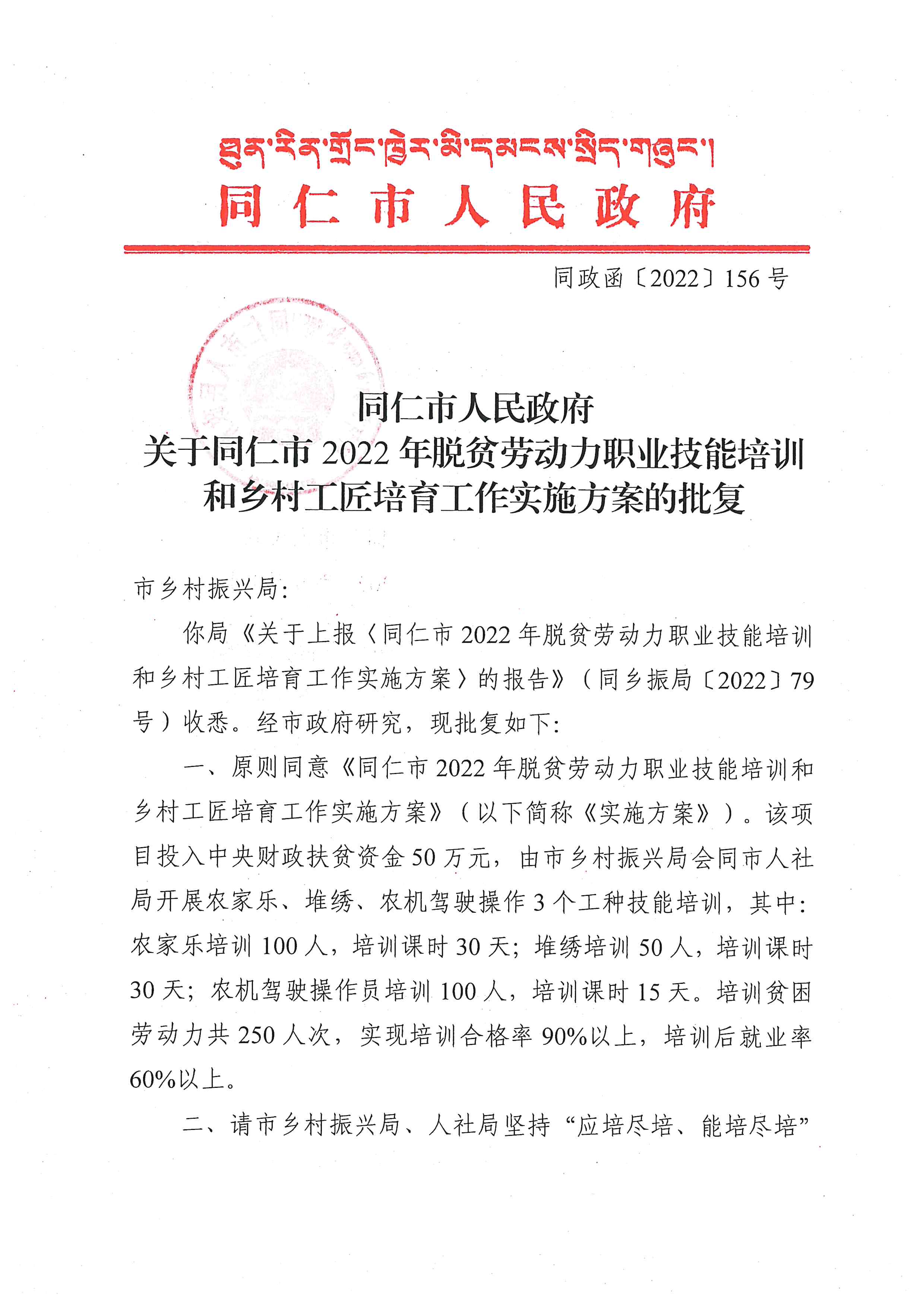 关于同仁市2022年脱贫劳动力职业技能培训和乡村工匠培育工作实施方案的批复