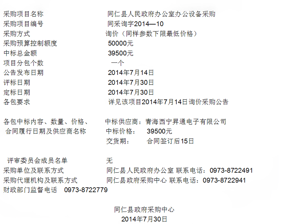 同仁县政府采购中心询价采购中标结果公告(同仁县人民政府办公室办公设备采购)