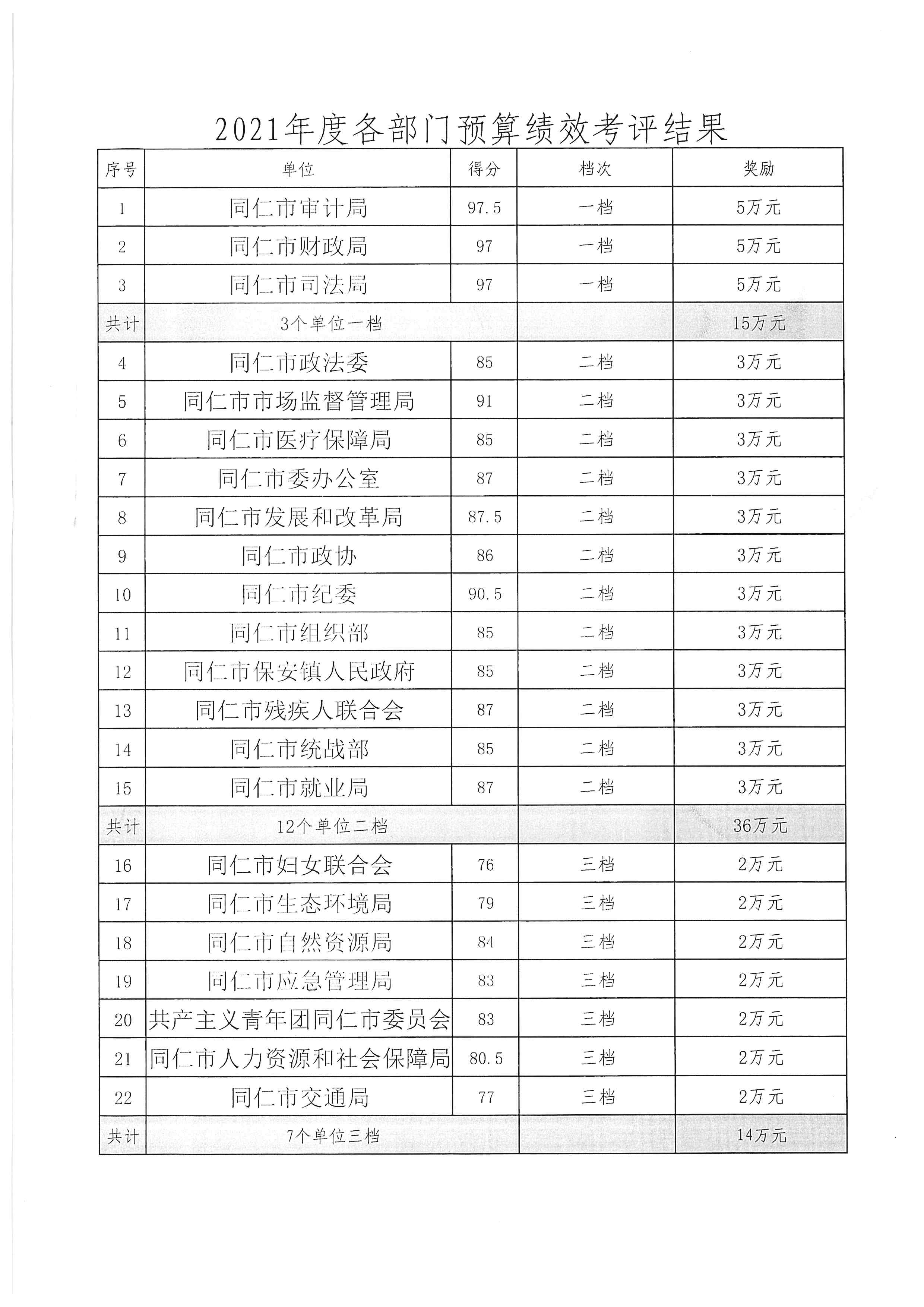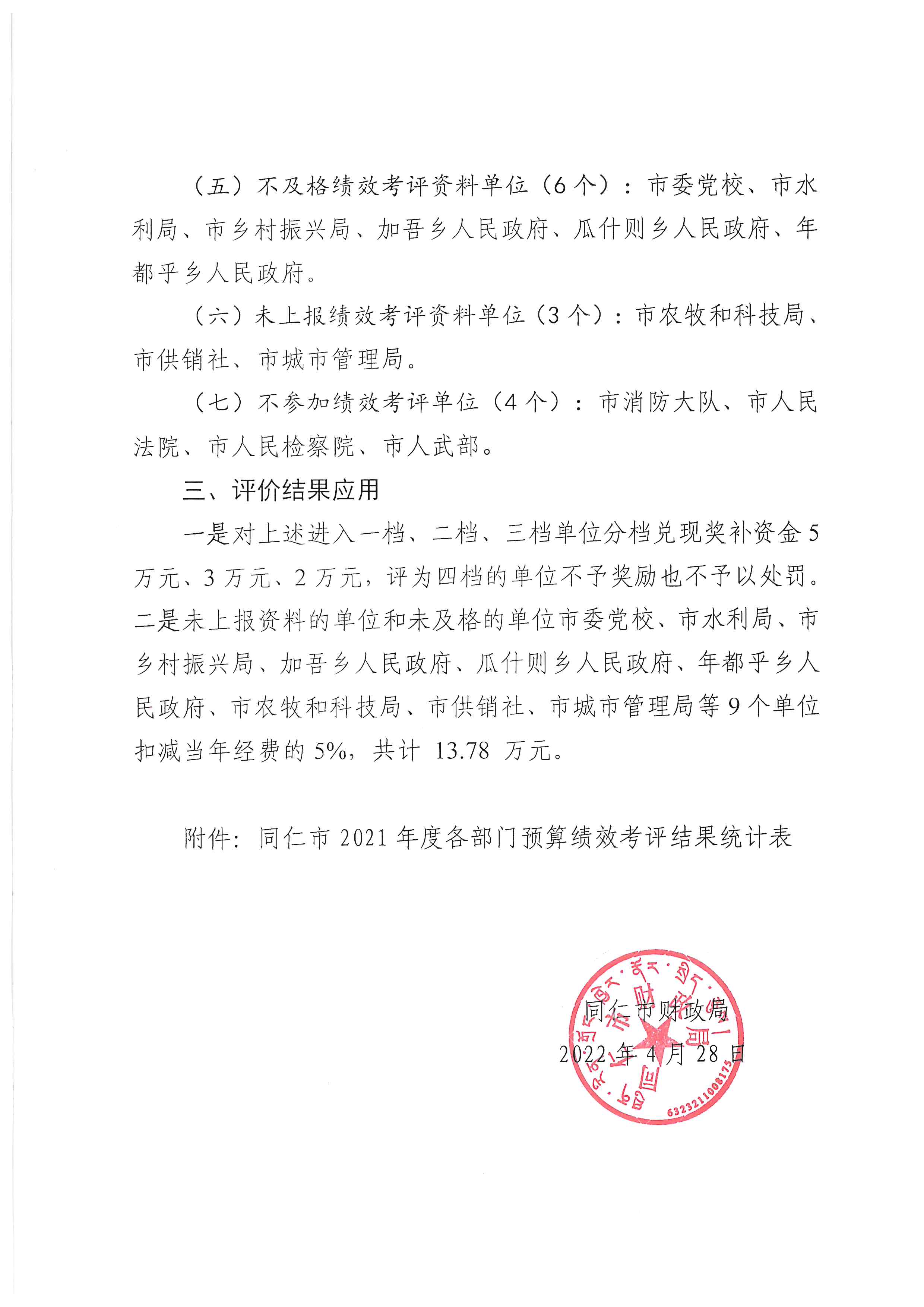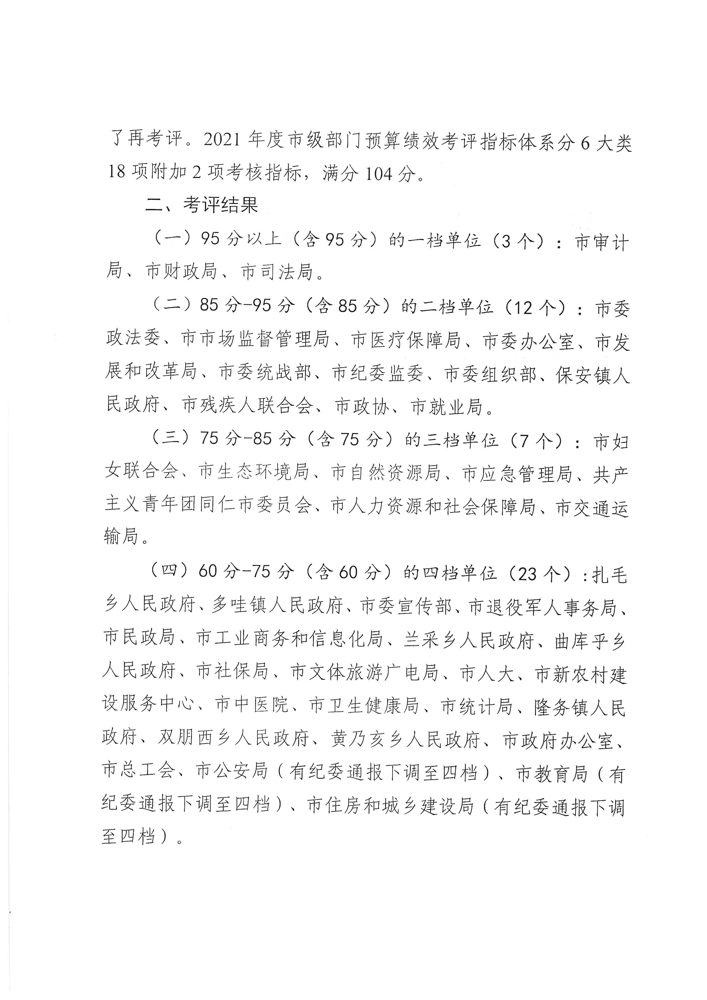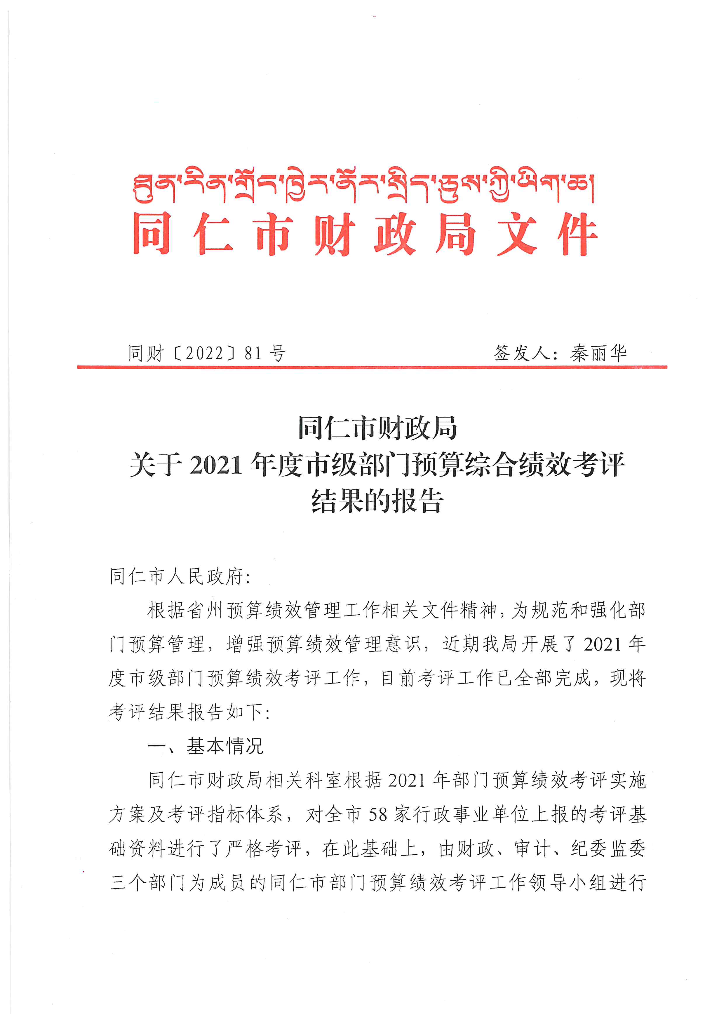 同仁市财政局关于2021年度市级部门预算综合绩效考评结果的报告