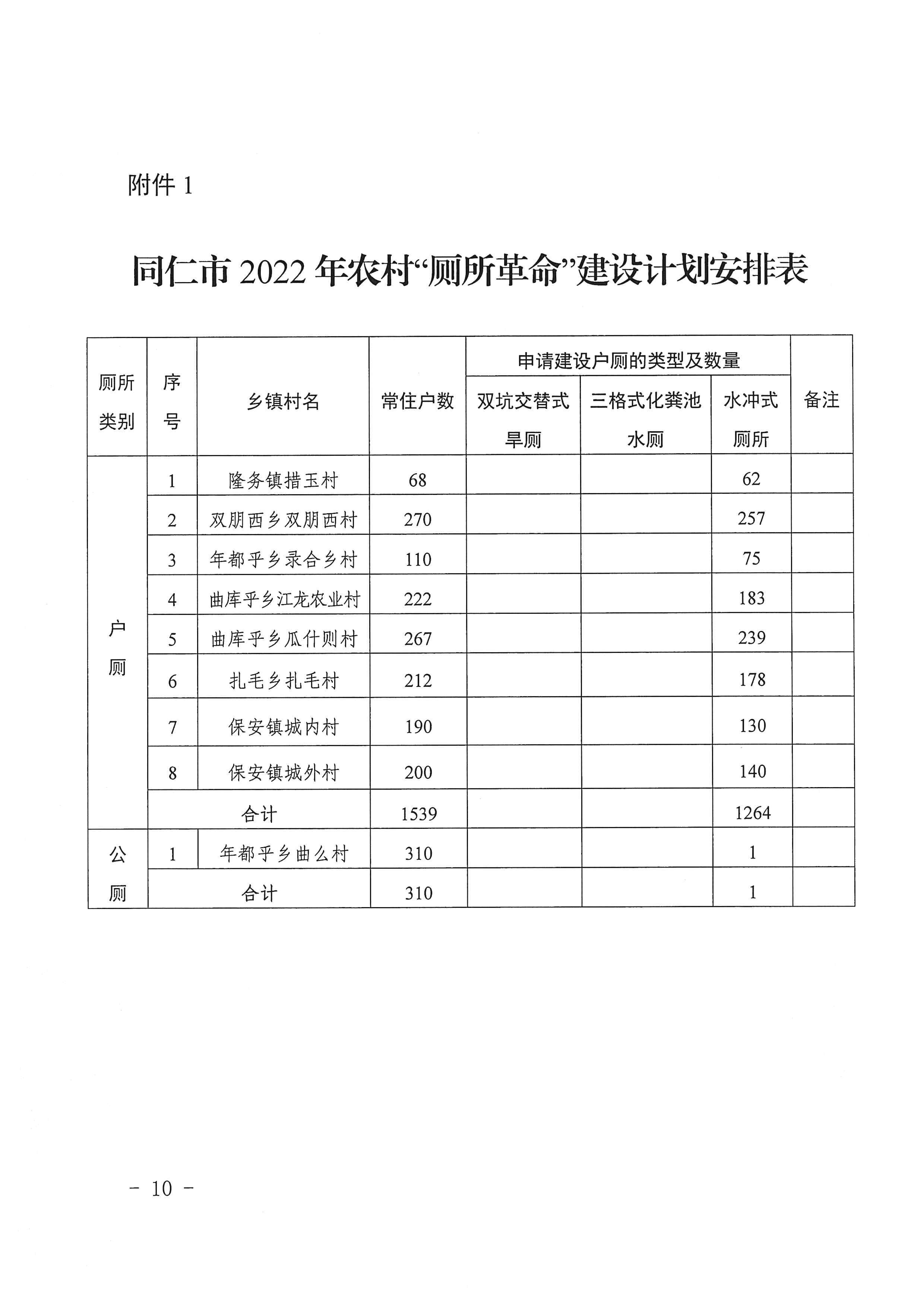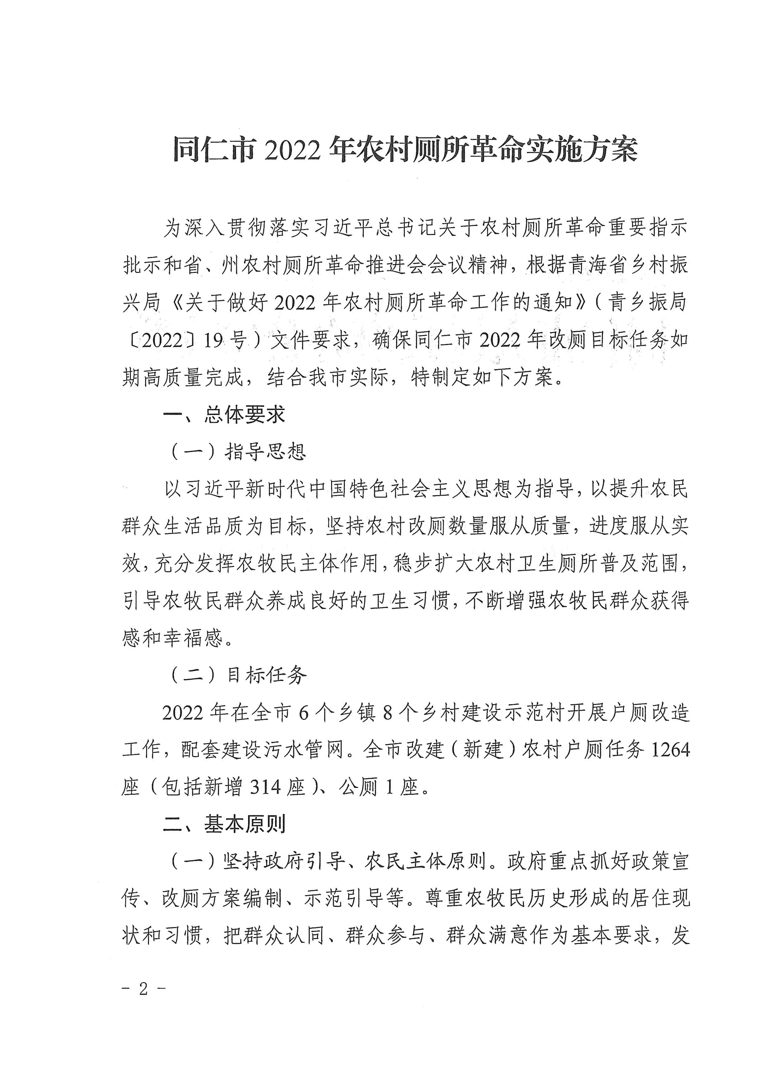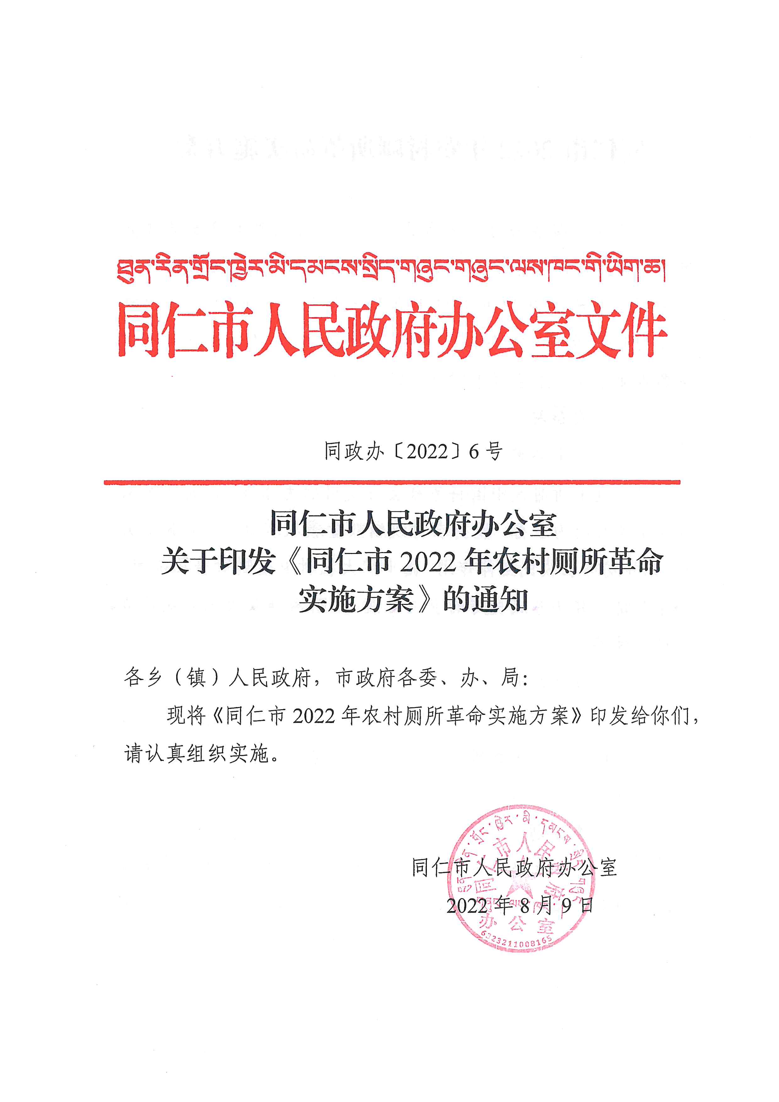 关于印发《同仁市2022年农村厕所革命实施方案》的通知