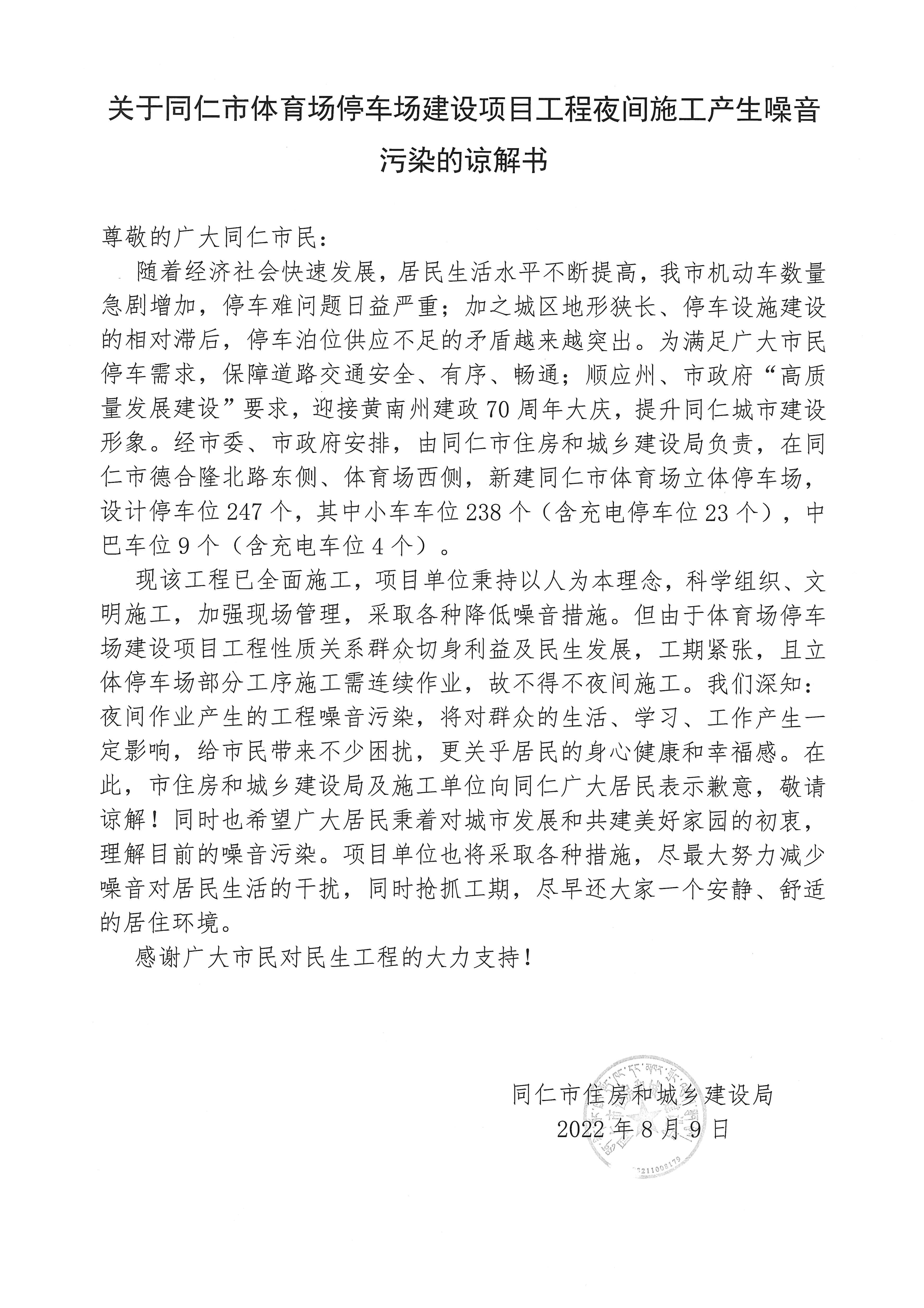 关于同仁市体育场停车场建设项目工程夜间施工产生噪音污染的谅解书